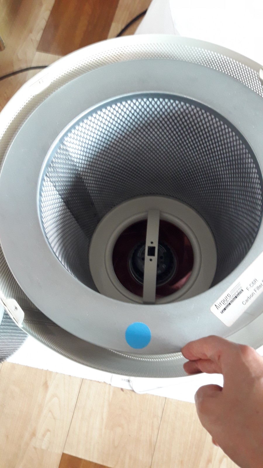 그리고 바깥 필터가 풀리지 않게 잘 잡으시고 그대로 들어서 공기청정기 통안에 집어 놓습니다.