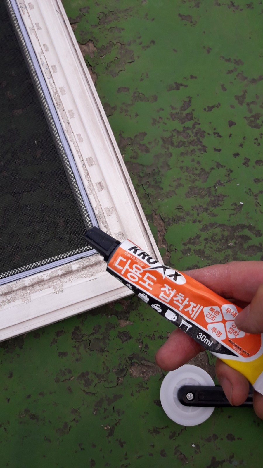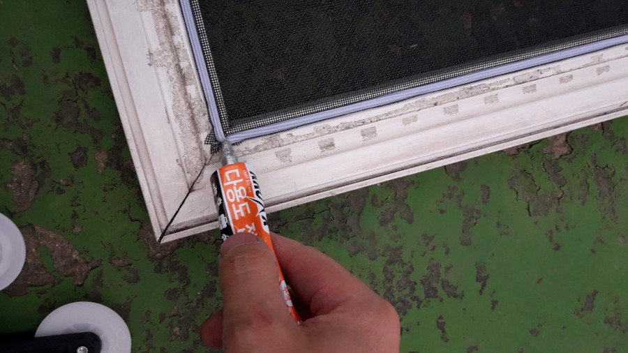 방충망 밀대(로라)의 뾰쪽한 부분을 이용해서 샷시 모서리 부분의 고무가스켓을 꾹꾹 눌러서 집어 놓습니다.
