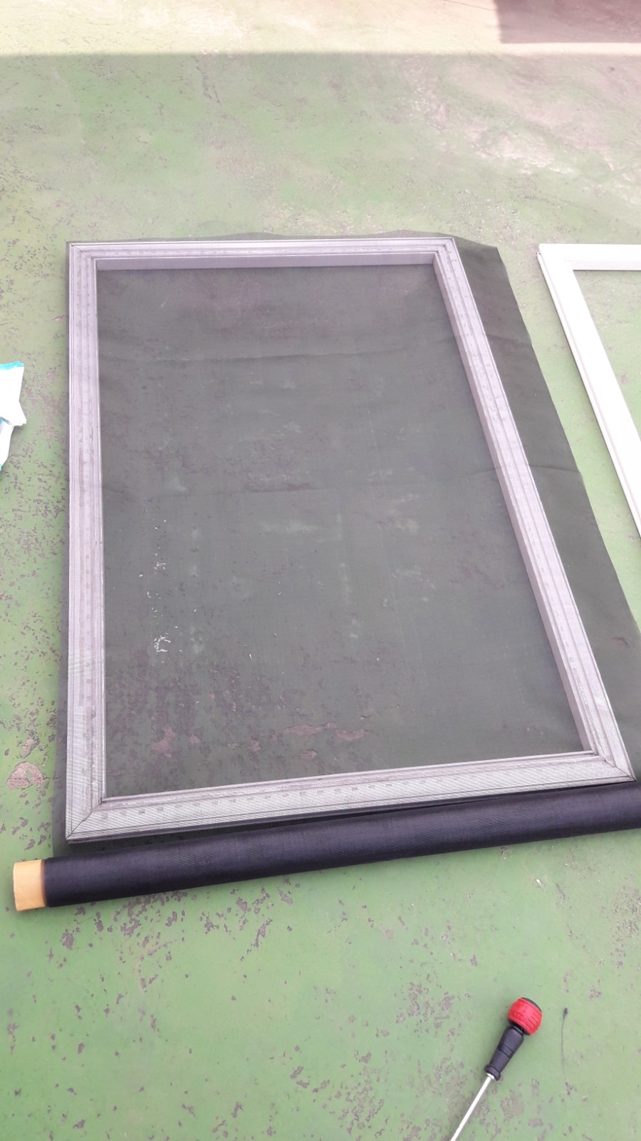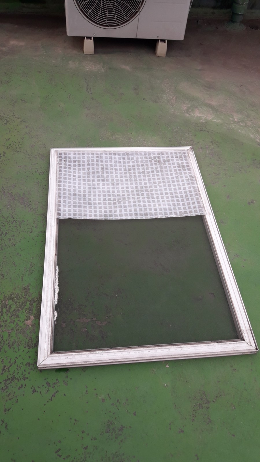 옥상 바닥에 오래된 방충망샷시를 눕히고