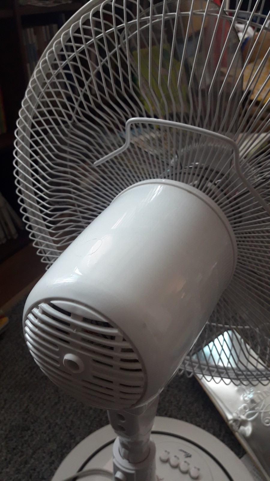 선풍기 뒤쪽에 철 옷걸이를 이용해서 고정시켰습니다.