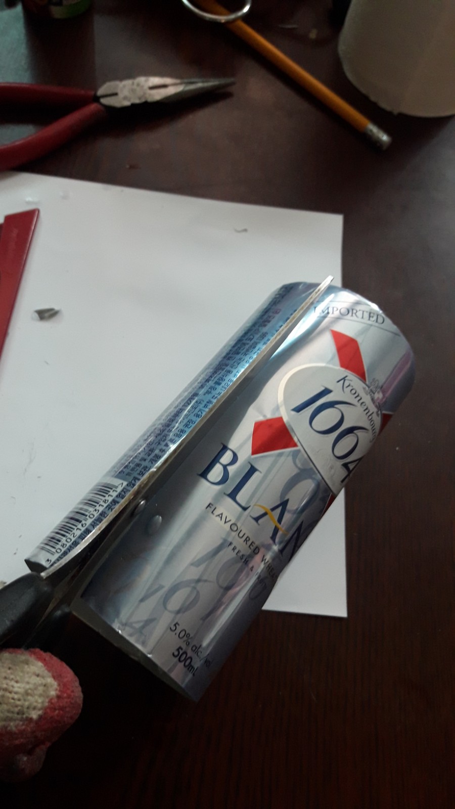 이제 잘 다듬어진 맥주캔을 가위를 사용해서 새로로 잘라줍니다.