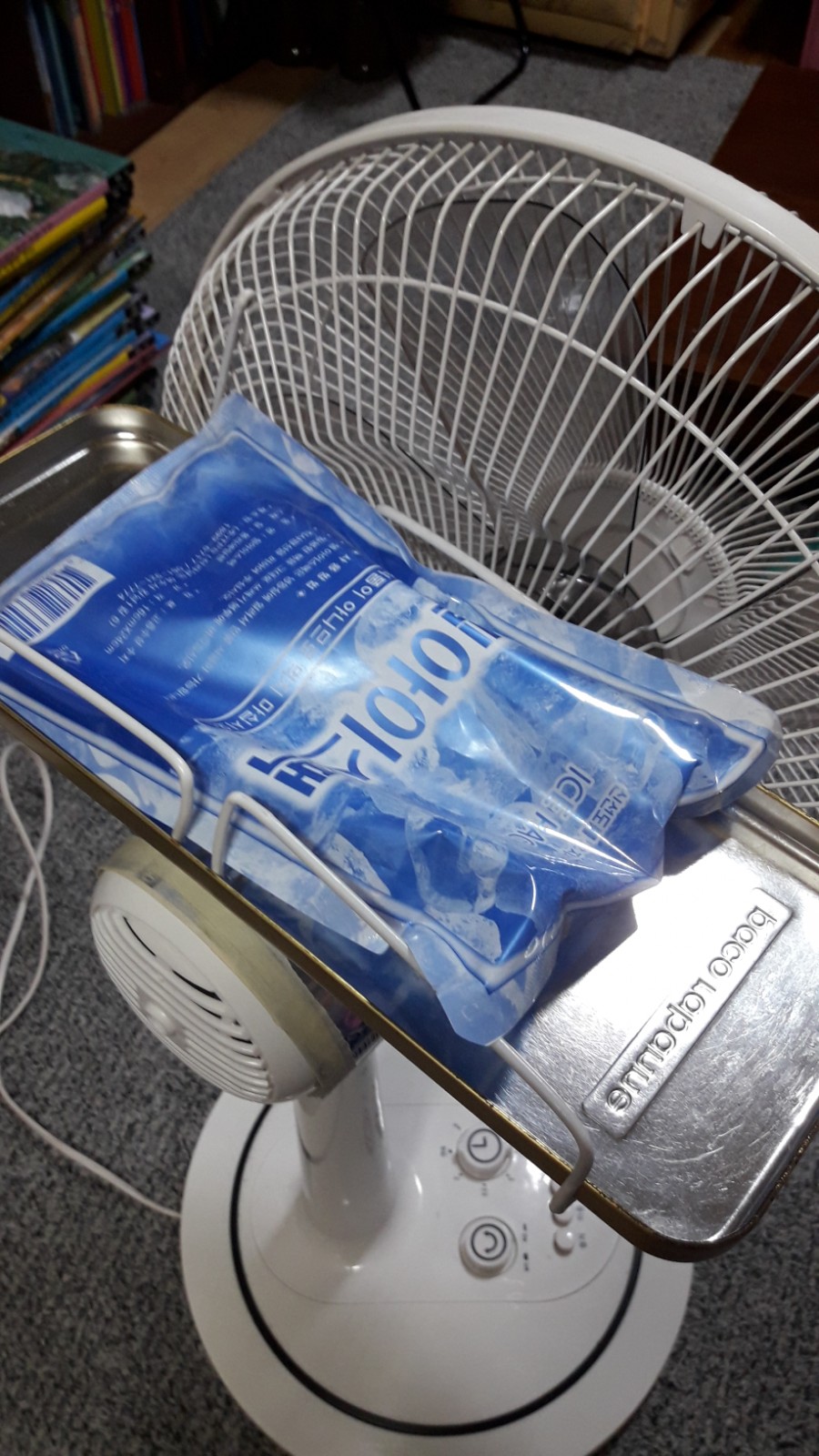 그리고 땡땡 얼린 아이스팩이나 얼음주머니를 저기 위에다가 올려 두시면 엄청 시원 바람이 나옵니다.