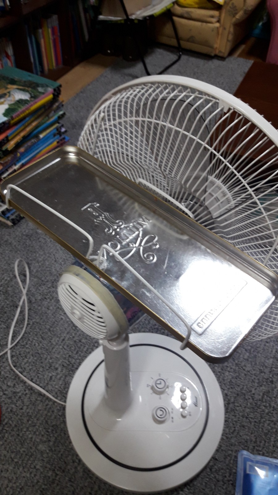 선풍기 뒤쪽에 철 옷걸이를 이용해서 고정시켰습니다.
