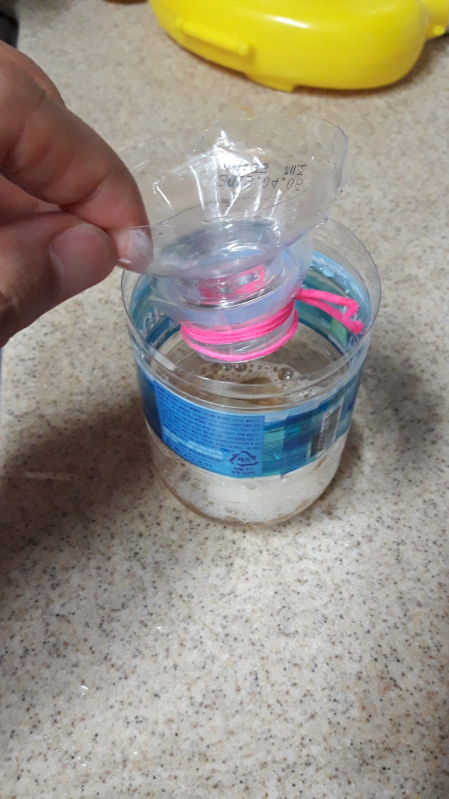 이제 페트병 위쪽 마개 부분에 랩을 씌워서 고무줄로 떨어지지 알게 잘 감아줍니다.