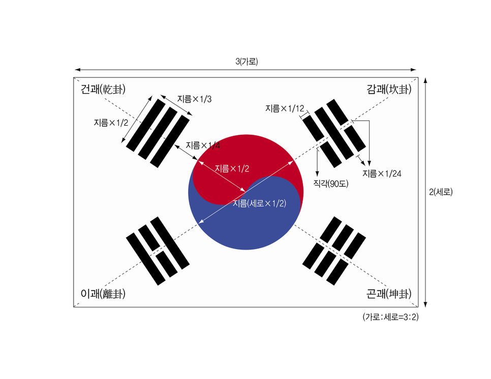 우리나라 국기(國旗)인 '태극기'(太極旗)는 흰색 바탕에 가운데 태극 문양과 네 모서리의 건곤감리(乾坤坎離) 4괘(四卦)로 구성되어 있다.