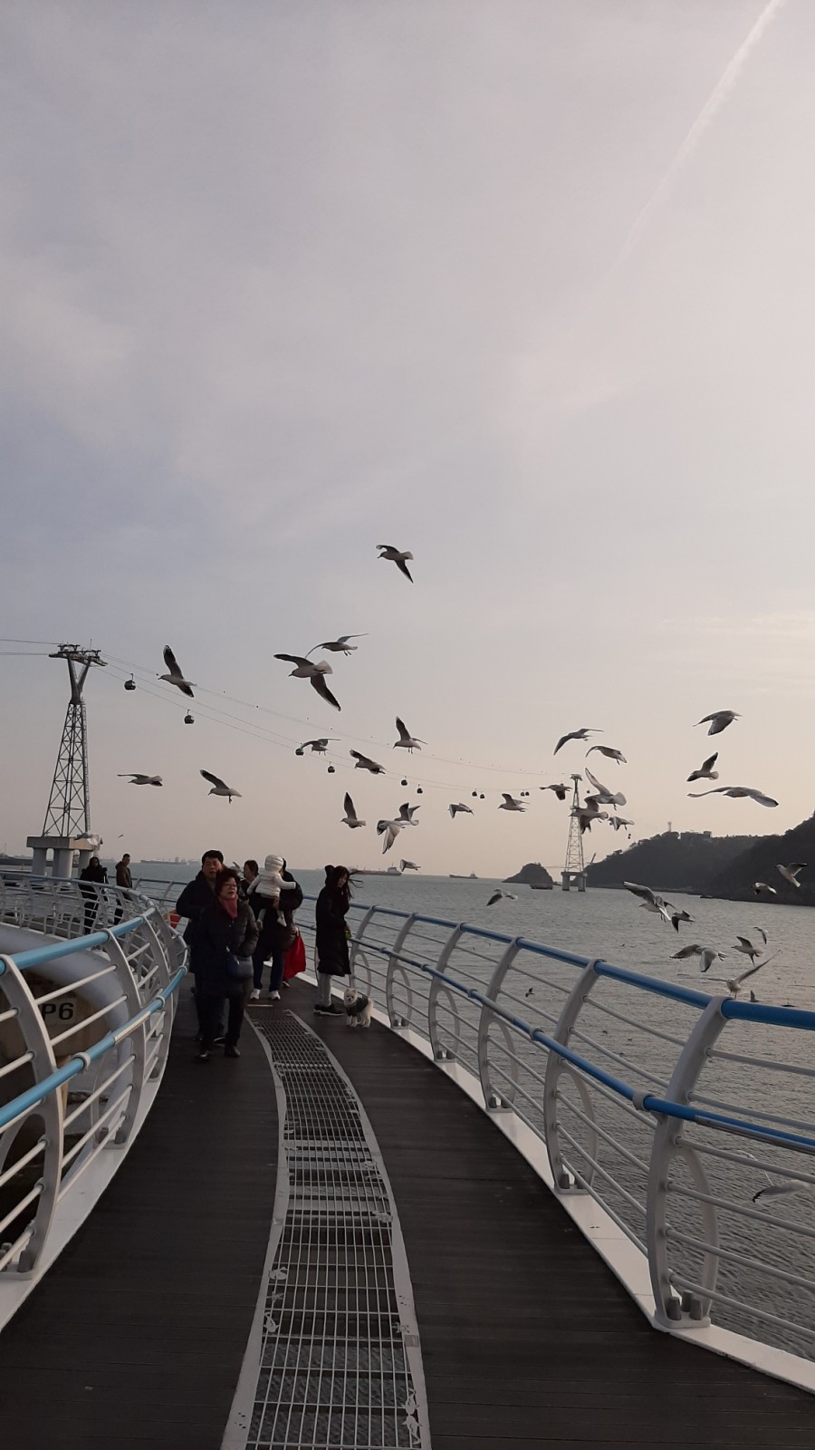 갈매기들을 몰면서 스카이워크 쪽으로 걸어갔어요.