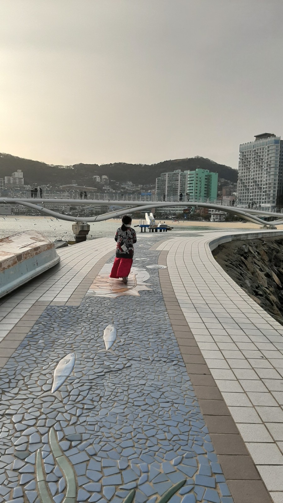 갈매기들을 몰면서 스카이워크 쪽으로 걸어갔어요.