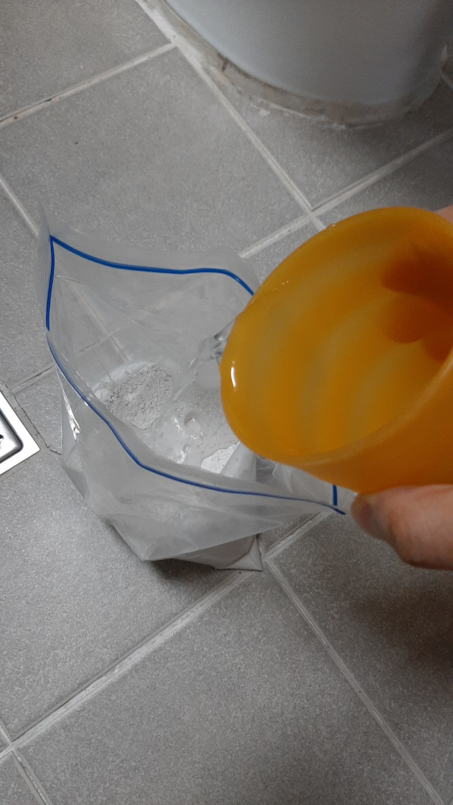 아까 가위로 자른 지퍼백을 손으로 쭉 짜면서 변기 아래쪽에 발라주세요.