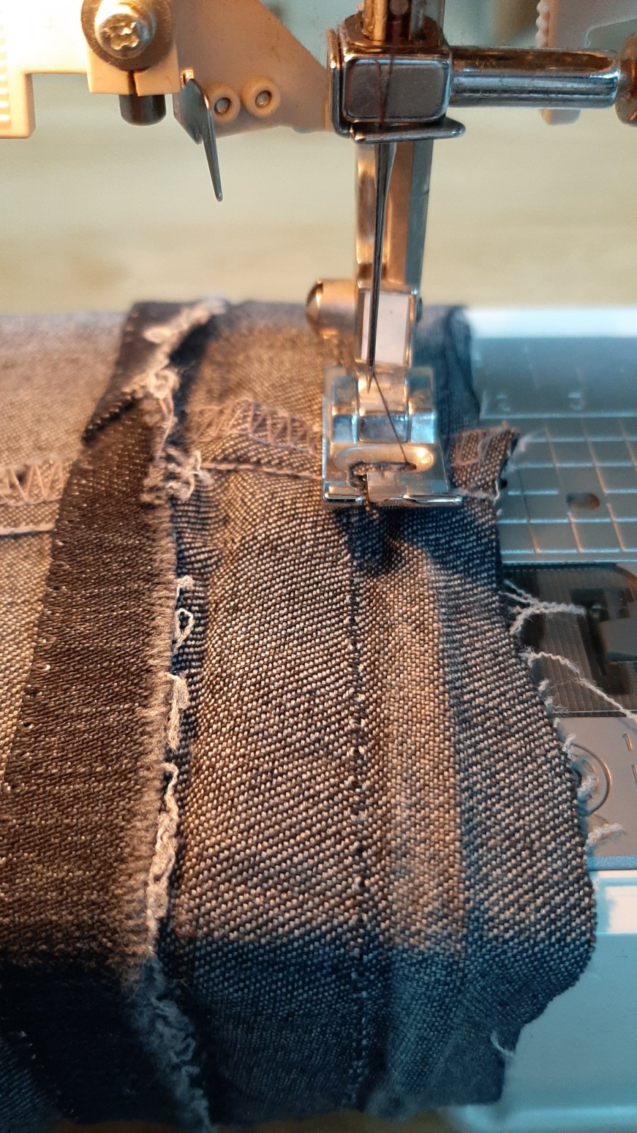 이제 밑단의 원래 실이 있던 부분을 따라서 미싱으로 드르륵 박아주시면 됩니다.