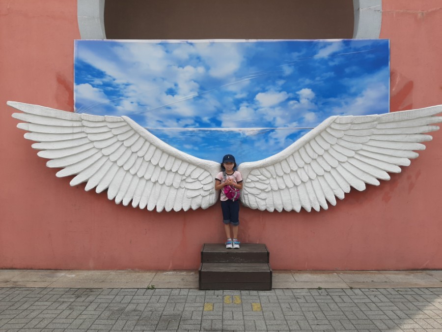 푸드코트 옆에 큰 날개가 있는 포토존에서 사진을 찍었어요.