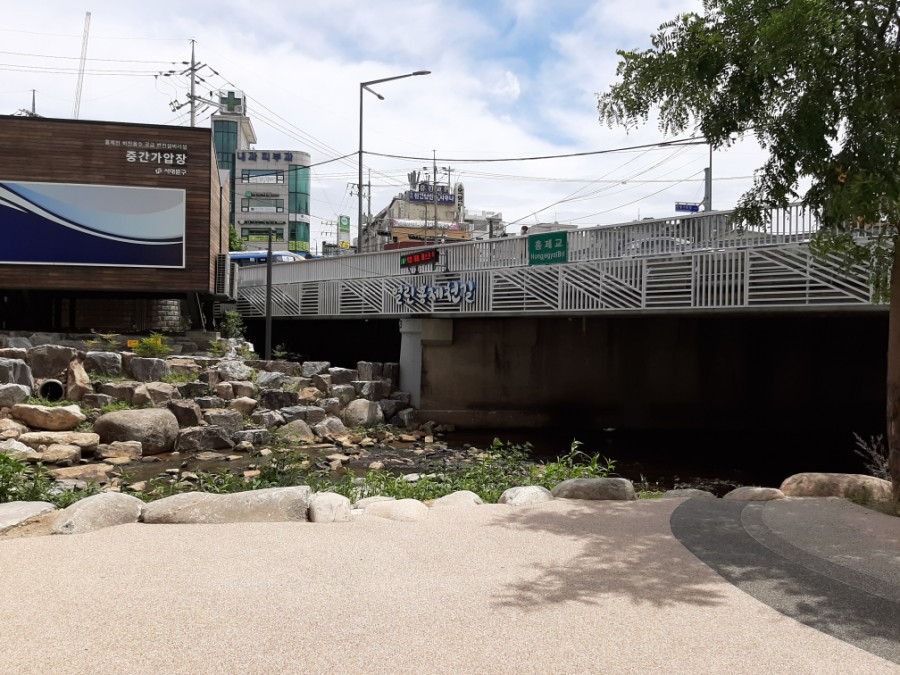 다리 아래쪽에는 홍제천이 보이고요.