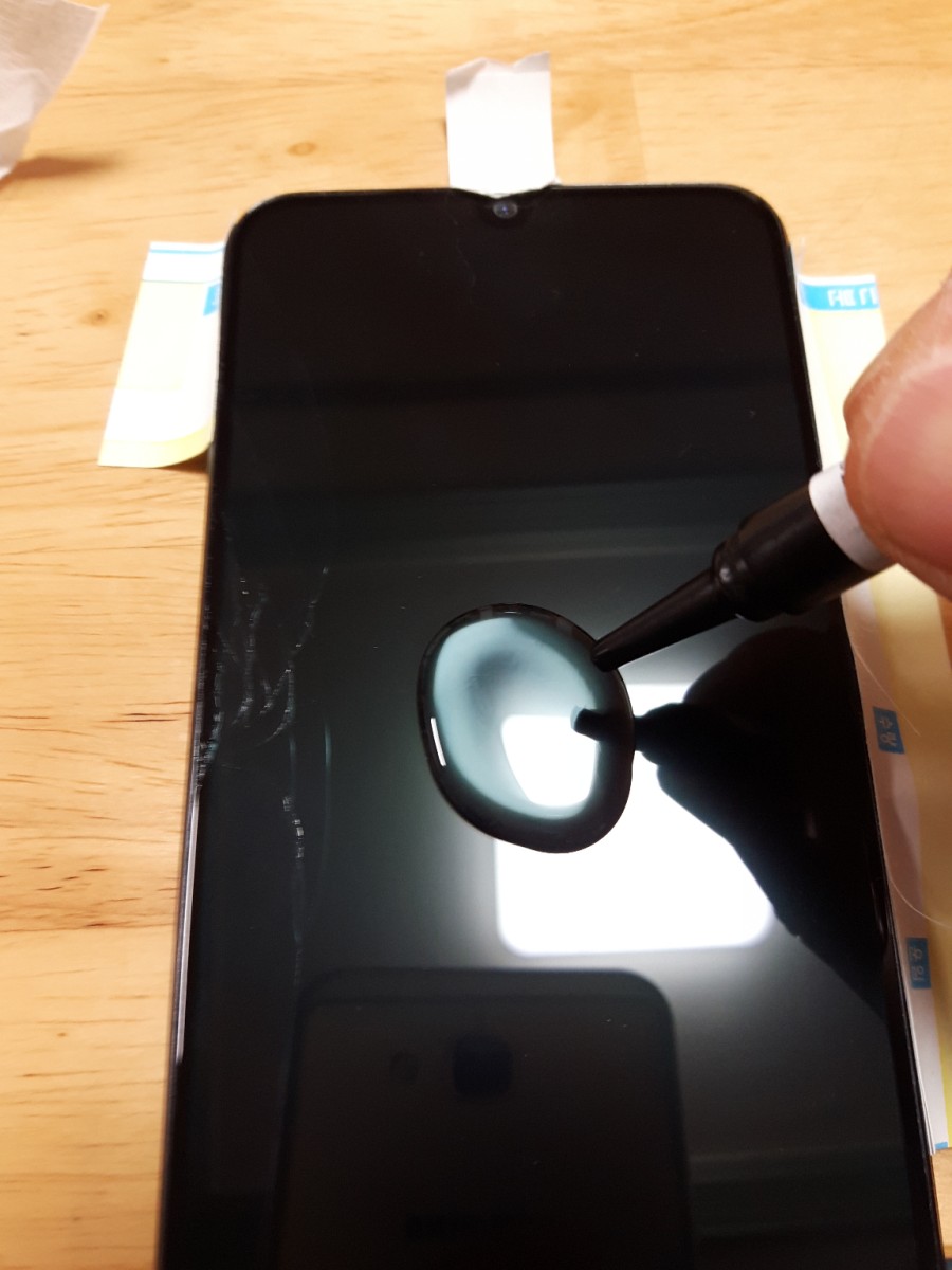 그런 다음 휴대폰 액정 위에다가 UV접착제를 기포가 생기지 않게 짜주세요.