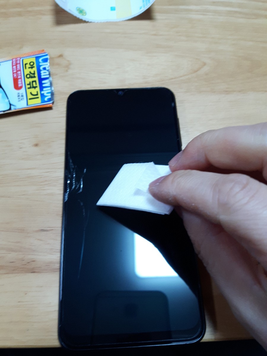먼저 액정 클리너로 휴대폰 액정을 깨끗하게 닦습니다.
