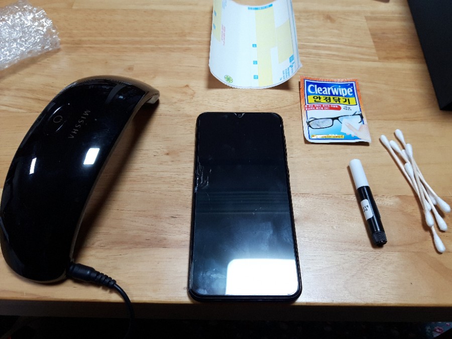 준비물 : 액정 깨진 휴대폰, UV접착제, UV램프 경화기, 액정클리너, 스티커, 면봉
