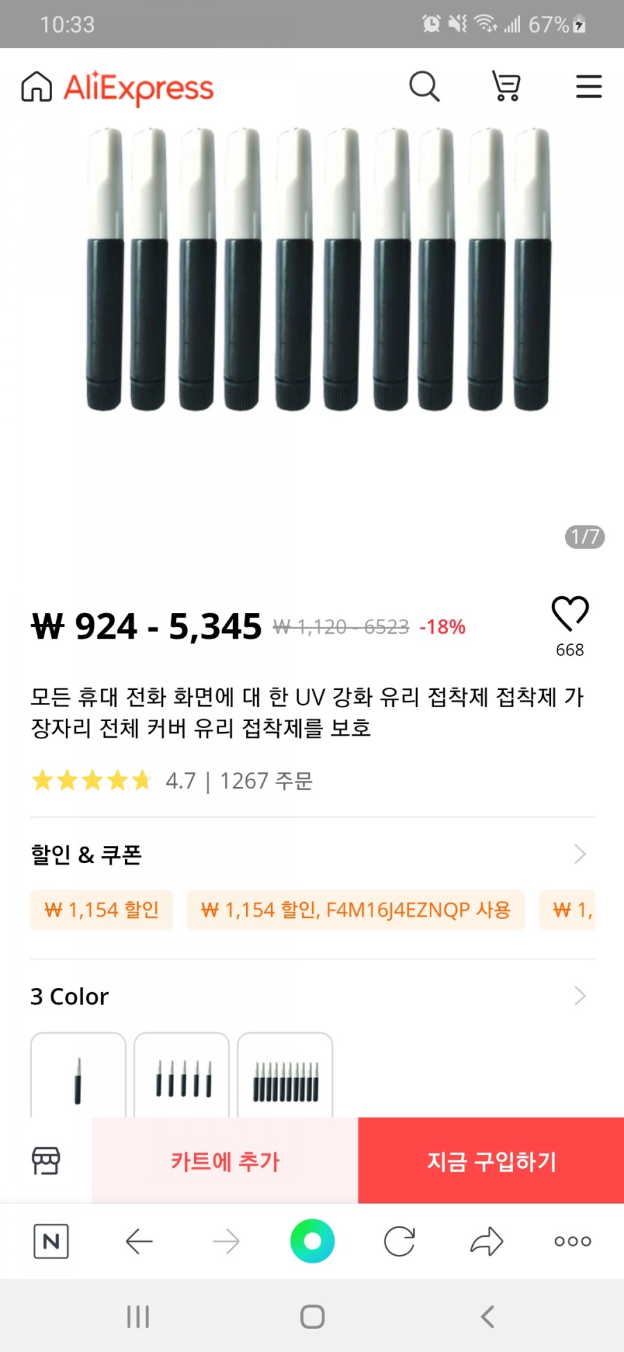 알리익스프레스에서 UV강화 유리 접착제 한 개에 924원 무료배송 ㅎ