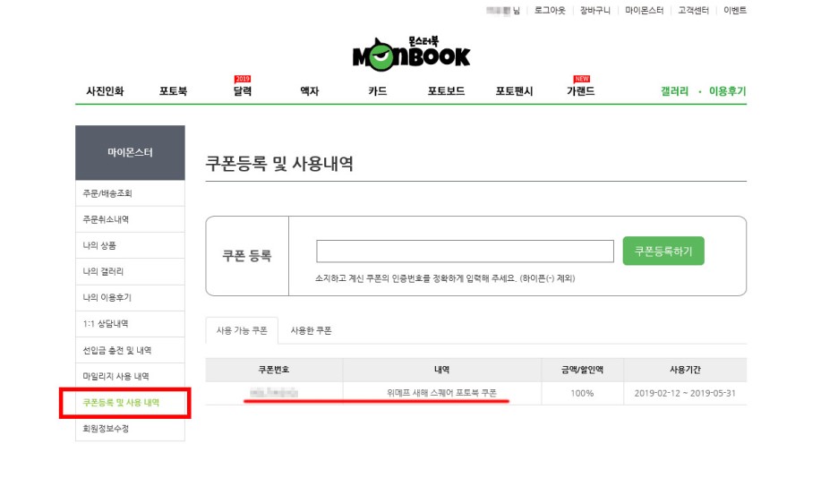 마이몬스터페이지 왼쪽 메뉴에 "쿠폰등록 및 사용 내역" 메뉴로 들어갑니다.