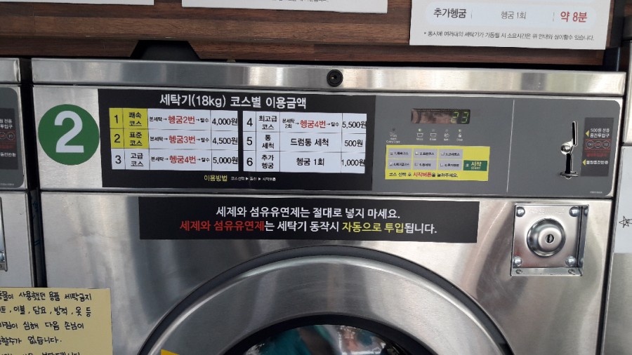 세탁기 기계 위에 보시면 코스별 설명이 나와있고 가격이 표시되어있다.