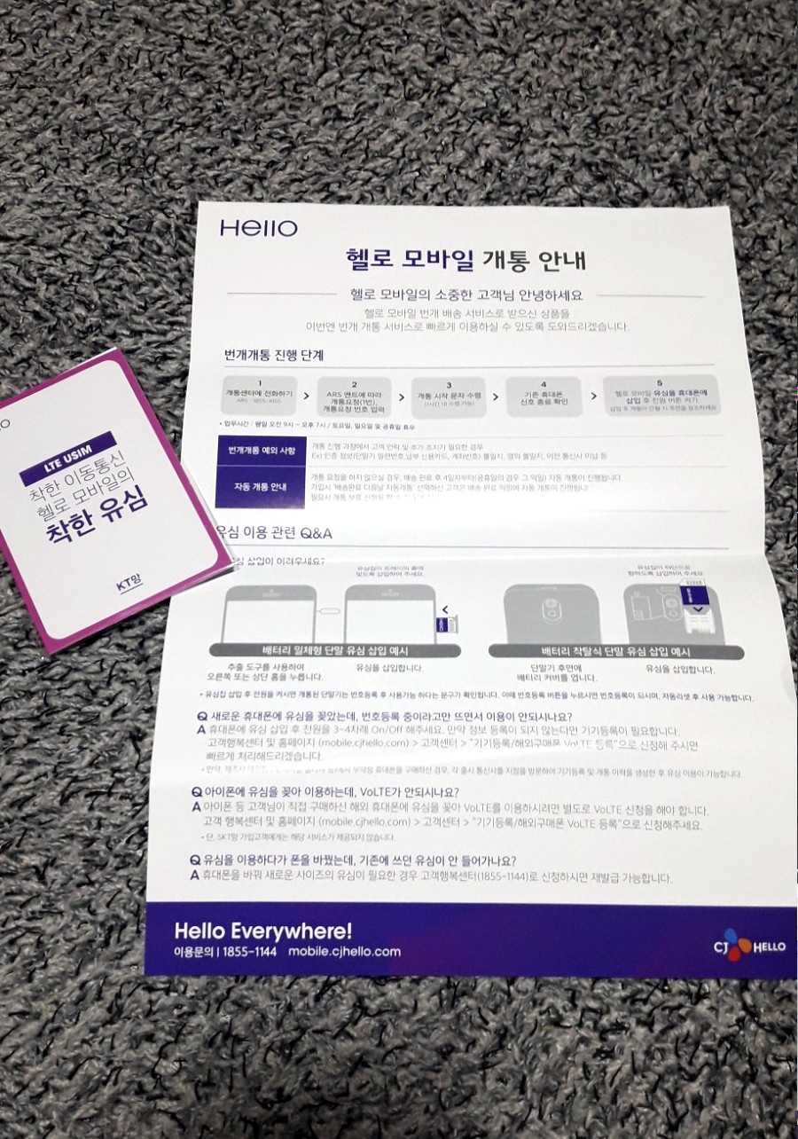 포장을 뜯으니 휴대폰 개통 안내서와 유심카드가 들어있네요.