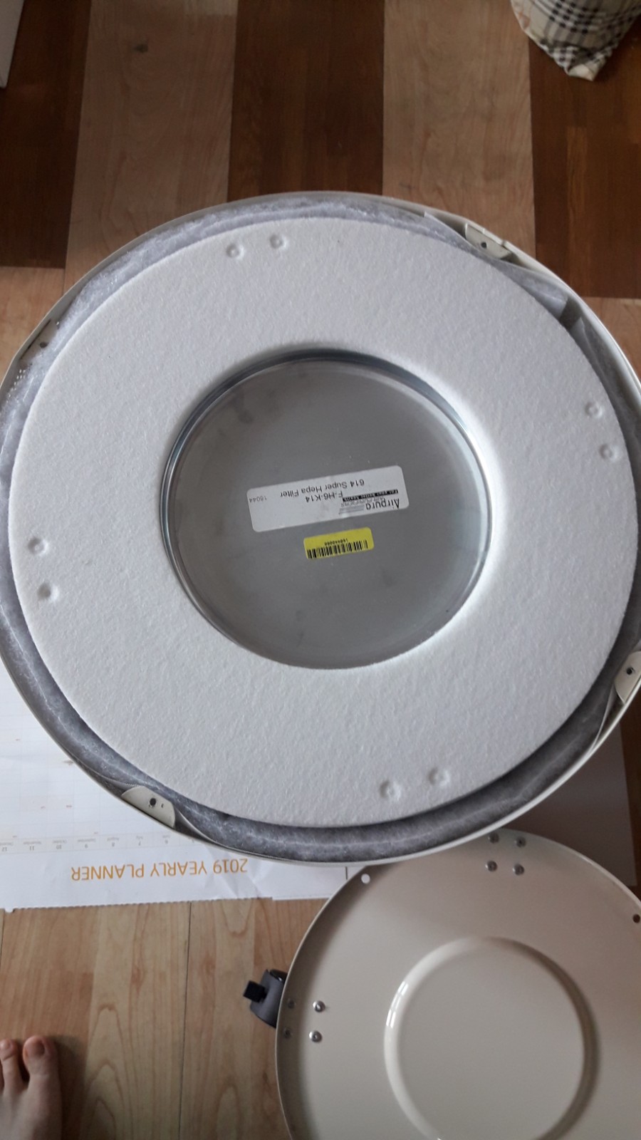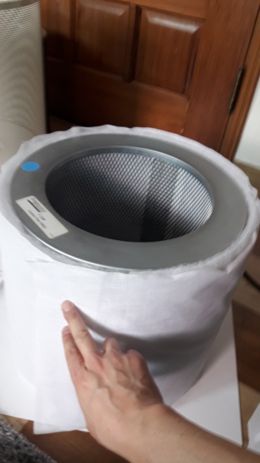 그리고 바깥 필터가 풀리지 않게 잘 잡으시고 그대로 들어서 공기청정기 통안에 집어 놓습니다.