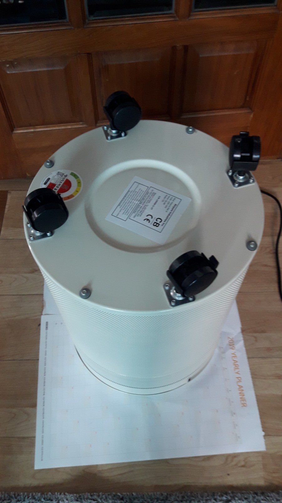 종이 위에다가 에어퓨라 공기청정기를 뒤집어 놓습니다.