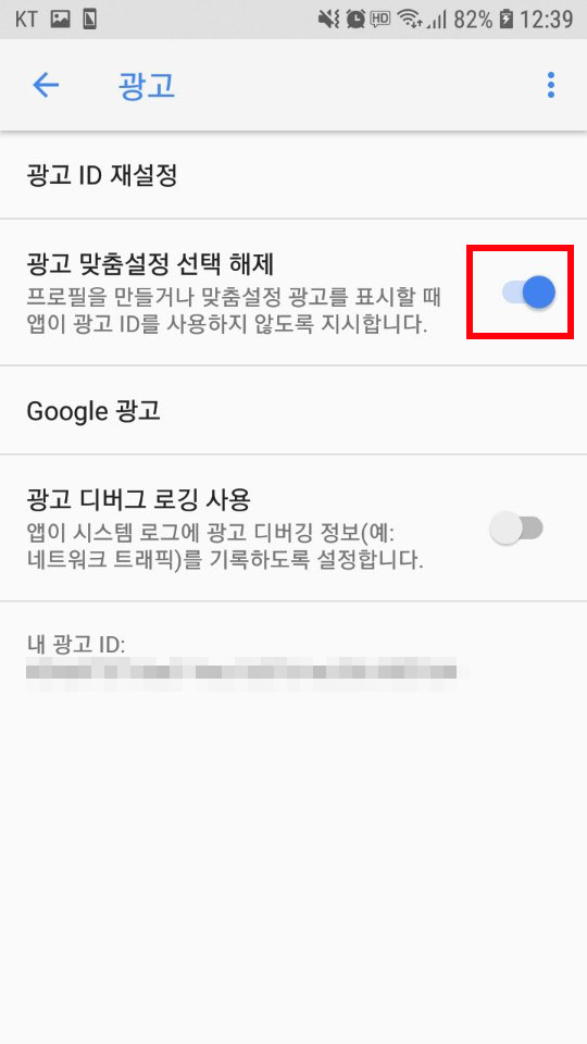 "광고 맞춤설정 선택 해제"라는 항목이 있다.