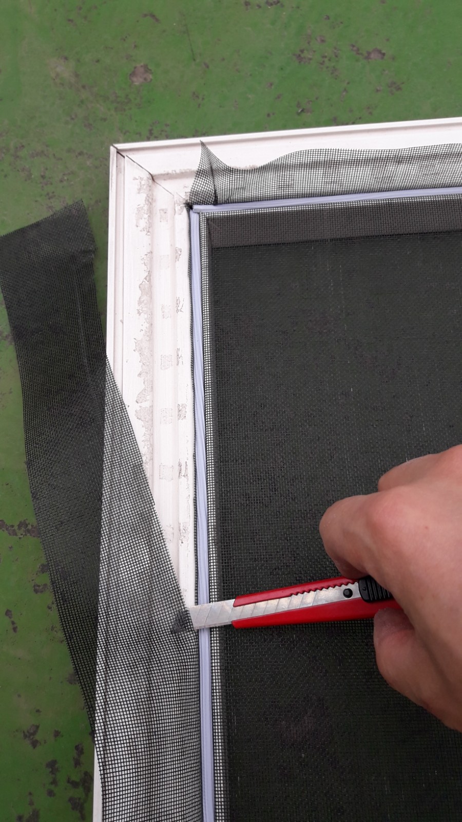 삐져나온 방충망을 커터 칼로 잘라줍니다.