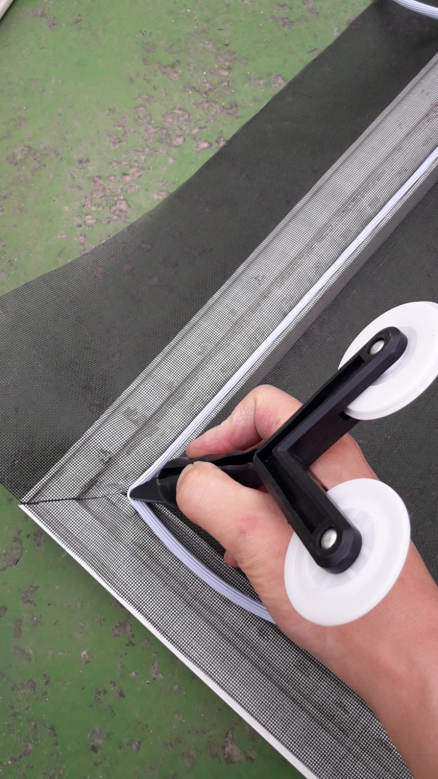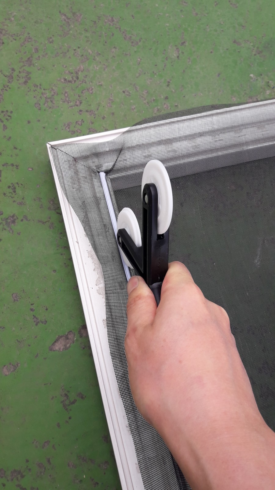 고무가스켓을 홈에 집어놓고 방충망로라의 홈이 있는 쪽으로 굴려서 고무가스켓을 눌러주면 쏙 들어갑니다.