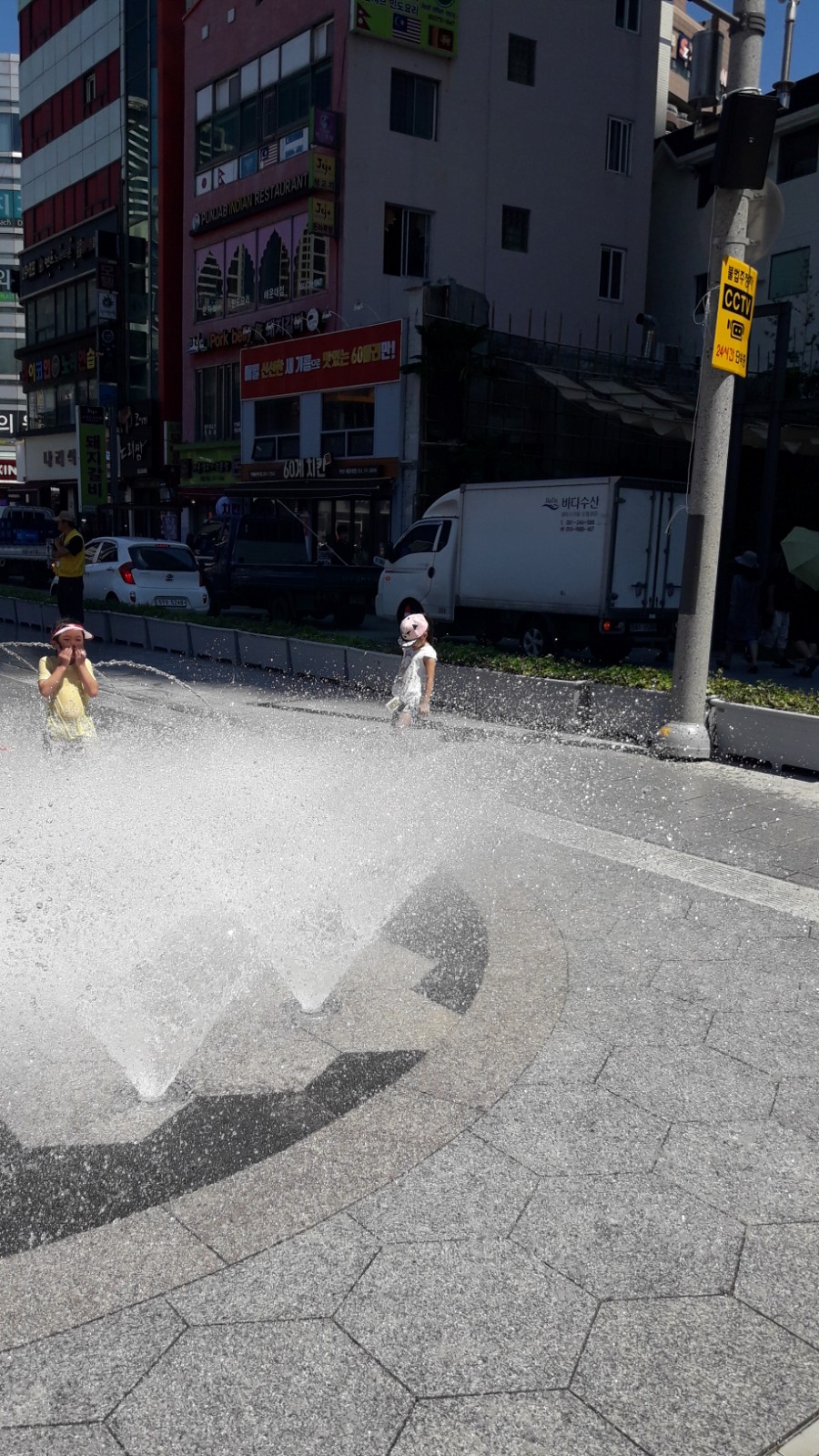바닥분수가 나오고 있어서 아이들이 신나게 놀고 있었어요.