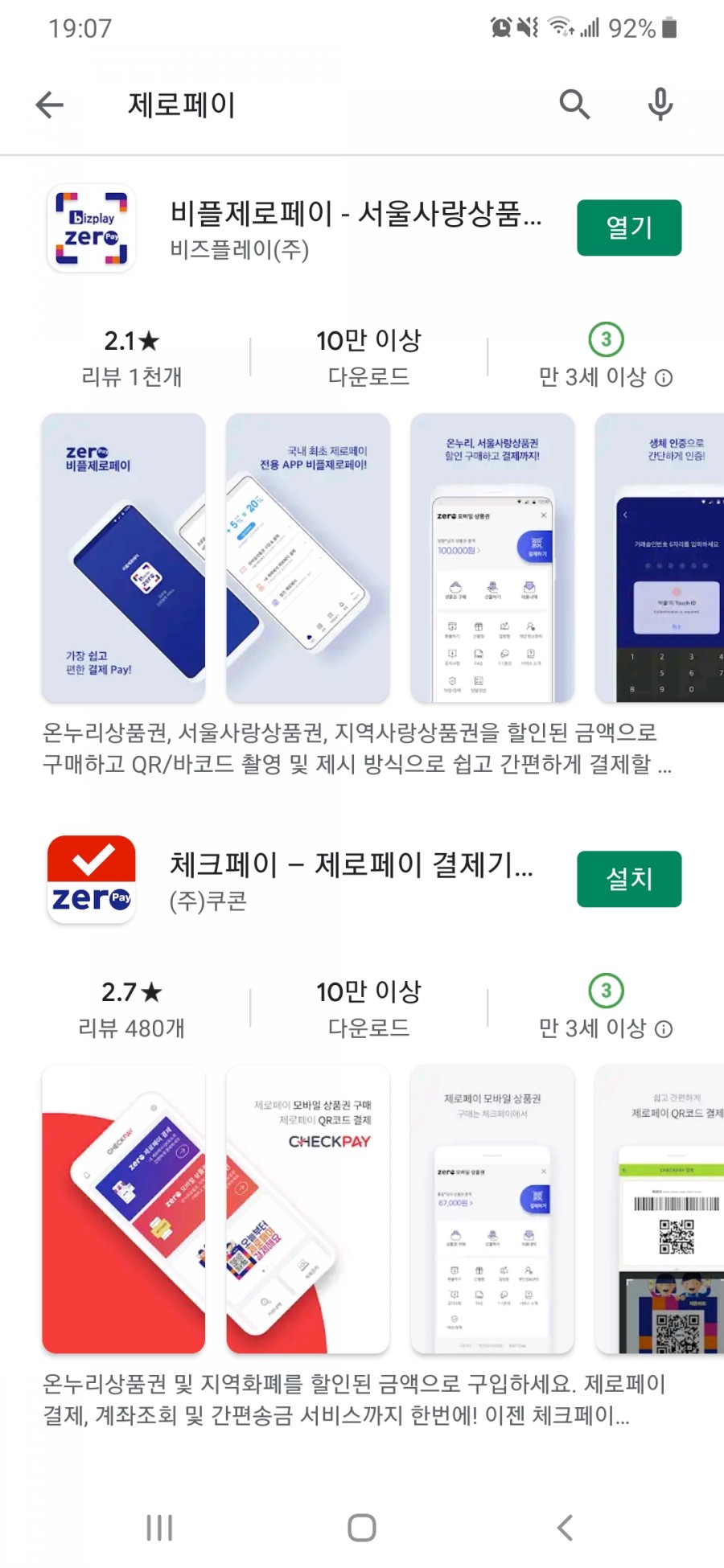 그래서 저는 구글 플레이스토어에서 '제로페이'로 검색하면