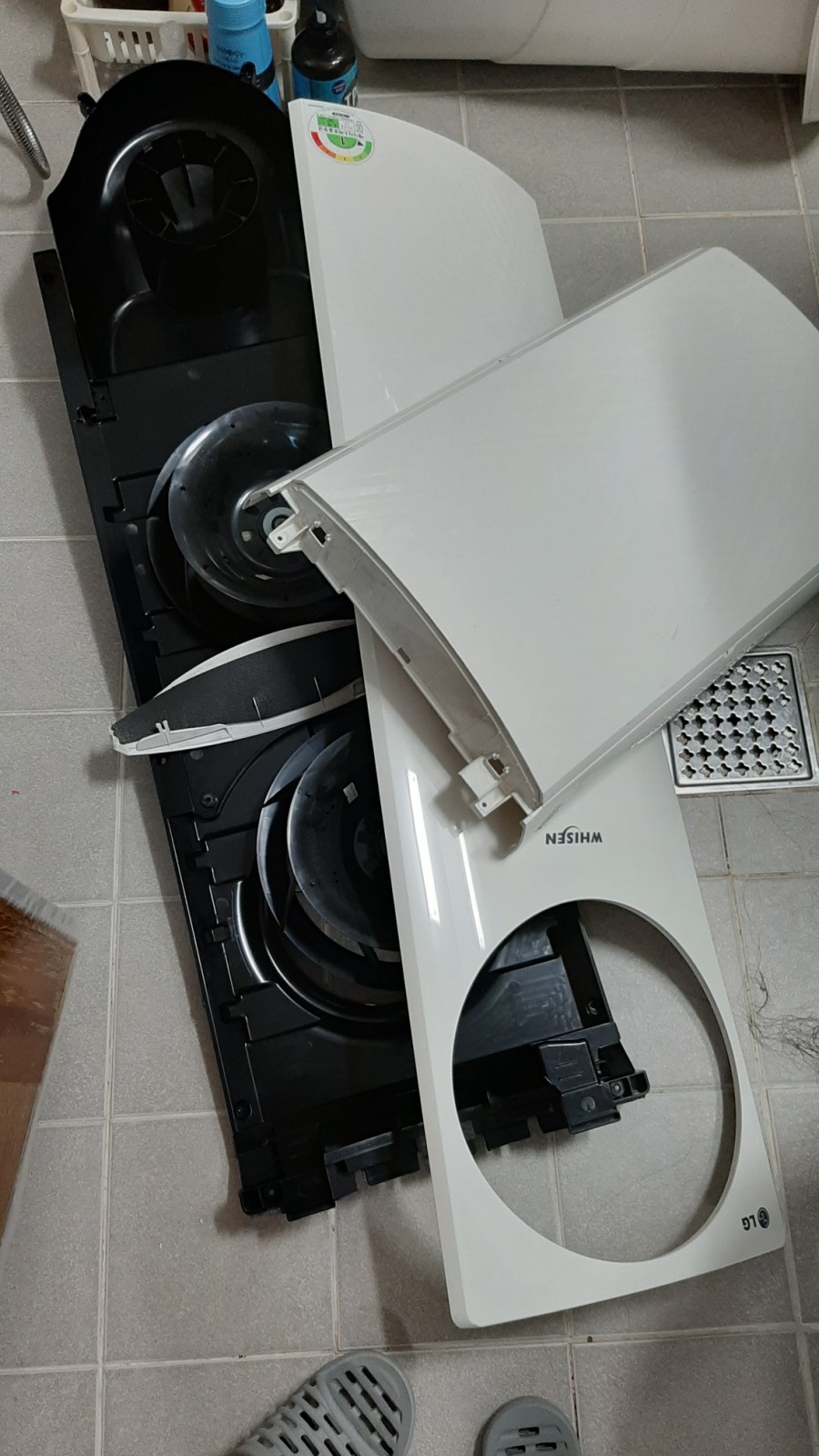 에어컨에서 분리한 부품들을 욕실에 가져가서