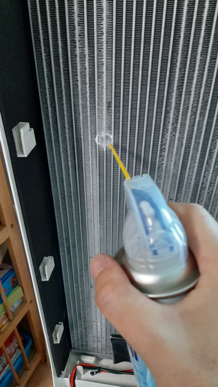 에어컨 세정제 청소 스프레이로 냉각핀 한 줄 한 줄 뿌려줍니다.