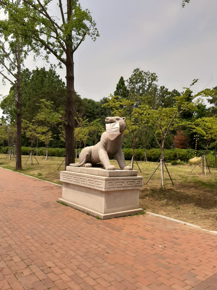 코로나 때문에 사자상도 마스크를 썼네요.