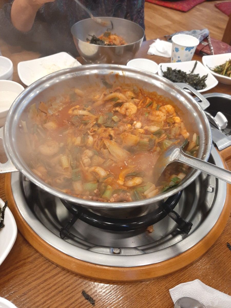 냄비 안에 낙지, 곱창, 새우가 들어있어요. ㅎㅎ
