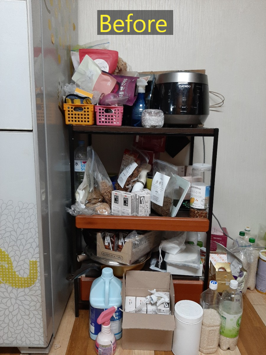 저희 집 냉장고 옆 선반 모습입니다;;;