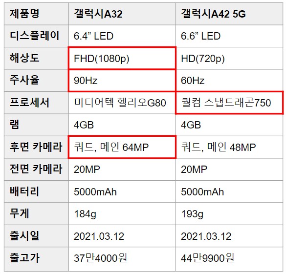 삼성 갤럭시A32와 A42 5G 스펙 차이점 비교하기 포스팅은 여기까지입니다~