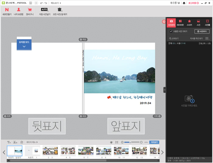 포토북 디자인을 고르면 기본적으로 사진만 넣을 수 있게 디자인은 다 되어 있어요.